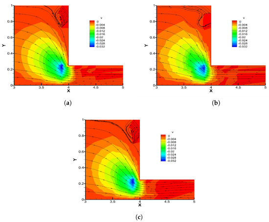 In Figure 5, we illustrate the streamlines of for standard FE. The left second figure depicts the streamlines of without stabilization and the third figure demonstrates the streamlines of with stabilization for the physical parameter , , and a are chosen consequently as 1, , and 1, respectively. It can be clearly seen that without the stabilization term for , FE streamline behaviours are different and show some irregular shape than standard FE and with stabilization of FE. In this perspective, the behavior of the streamlines with and appear in a similar traditional abrupt contraction channel which resembles the physical rule completely. The behavior of the streamlines confirms the theoretical results for the stabilization by lowest-equal order FE in approximation of the OVFF.