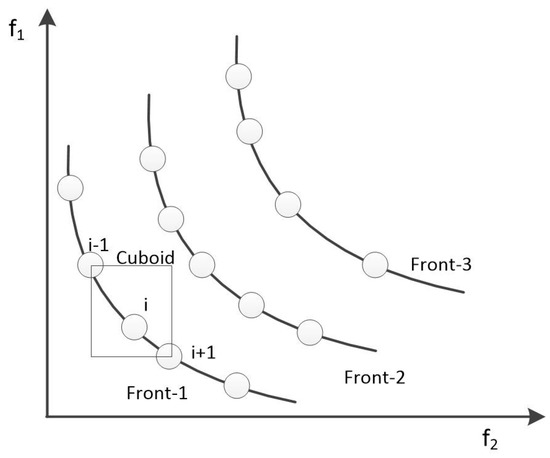 Two-dimensional example of crowding distance [27], the crowding distance is calculated within one Pareto front, its calculation method is , where o is the index of the number of objective functions, P is the number of objective functions, i is the index of individual, and is the value of an objective function.