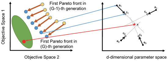 The second step estimates a convergence point in a parameter space using the moving vector pairs obtained from the first step. The estimation method uses Equation (7) to implement. The estimated point has high potential in the non-dominated Pareto solution frontier, and can therefore accelerate EMO search.