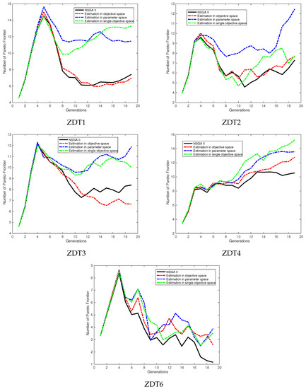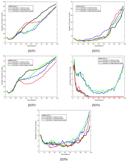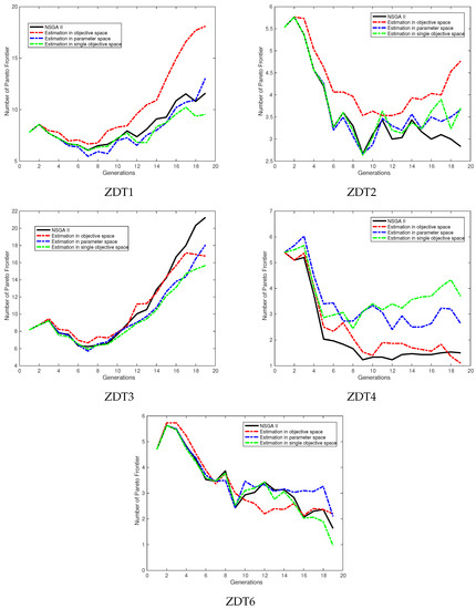 Conventional NSGA-II is adopted as an example algorithm; other EMO algorithms can be also applied. Although there are many ways to generate estimated points, the greedy replacement strategy, where the estimated points will replace with the worst ranked and low diversity individuals to keep the same population size, is adopted in the proposed acceleration framework. To analyze the effect of the proposed acceleration framework, we calculate the number of non-dominated Pareto solutions in each generation shown in Figure 4, Figure 5 and Figure 6.