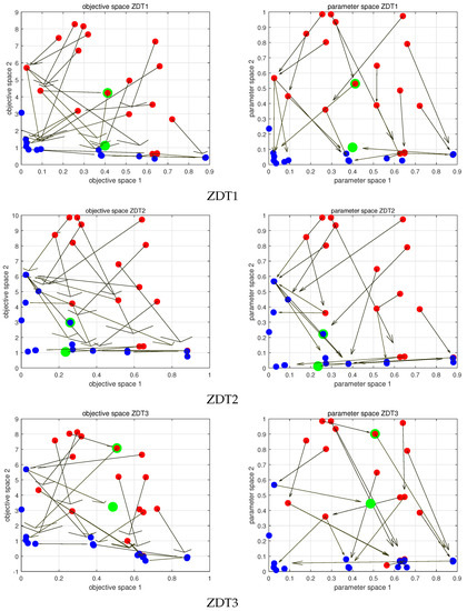 Two-dimensional demonstration of Pareto solution improvement in an objective space (left) and their corresponding individuals in parameter space (right) of ZDT1, ZDT2, and ZDT3. The arrows show directions of both Pareto solution improvement and moving vectors. We can observe that there is a uni-modal landscape for Pareto solution improvement in an objective space; however, it is a multi-modal landscape for Pareto improvement in a parameter space. The green point is the estimated convergence point, most of the red points and most of the blue points are in the first generation and in the third generation, respectively.