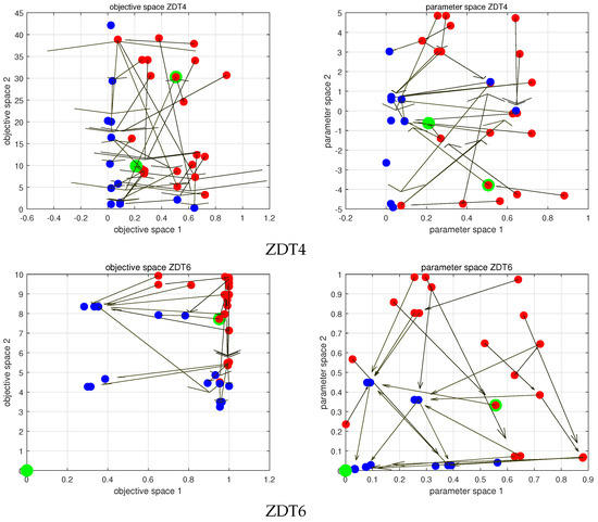 Two-dimensional demonstration of Pareto solution improvement in an objective space (left) and their corresponding individuals in parameter space (right) of ZDT4, and ZDT6. The arrows show directions of both Pareto solution improvement and moving vectors. We can observe that there is a uni-modal landscape for Pareto solution improvement in an objective space; however, it is a multi-modal landscape for Pareto improvement in a parameter space. The green point is the estimated convergence point, most of the red points and most of the blue points are in the first generation and in the third generation, respectively.
