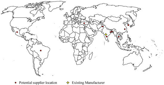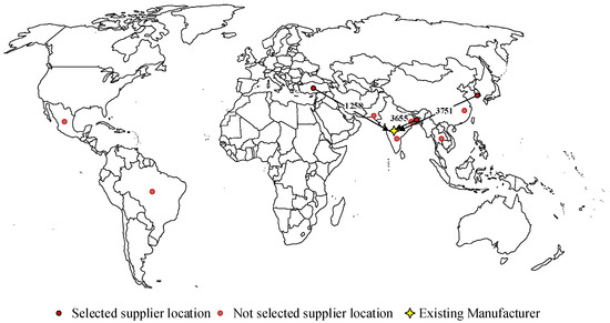 The Equation (1) represents the objective function for the cost. It is the sum of procurement cost and transportation cost from selected suppliers. The objective function of the total rate of rejection is estimated in Equation (2). The objective function for transit time from all selected supplier is calculated as shown in Equation (3). The Equation (4) shows the supply density for all selected suppliers. Total resilience index score objective is estimated in Equation (5). Where rss represents the resilience index score of supplier location obtained from FMGlobal [48].
