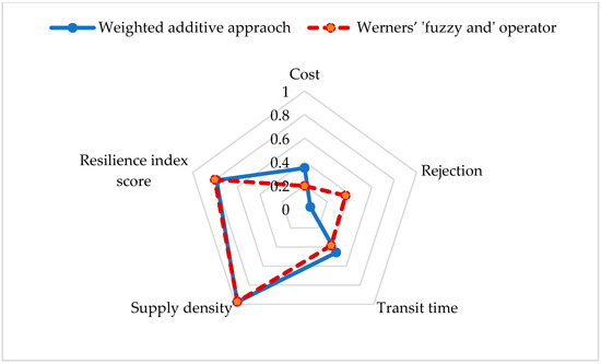 The proposed mathematical model is solved using both methods, that is, a weighted additive approach and Werners’ 'fuzzy and' operator methods. A solution of illustrated case example using both methods is shown in Table 6. The result shows that both methods produce a comprehensive optimal solution. However, the weighted additive approach considers the importance of objectives based on the weight given to each objective. For example, when more importance is given to resilience score (i.e., w5 = 0.3), it results in 78.6% achievement of aspiration level. On the other hand, when all objectives and equal importance (Werners’ method) than resilience score is given, the objective results in 34% achievement of aspiration level. Comparative analysis of both methods is shown in Figure 2.