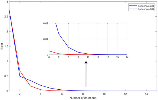 respectively. Let , and . It is easy to see that the sequences , , and satisfy the conditions and of Theorem 1. Moreover, we have . Therefore, our sequence (10) has the following form: