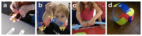 Some fun can be had making shapes this way. For example, I have done fair projects where participants learn to make a basket from a word (Figure 1a), or ‘evolve’ a new character sequence (via rewriting rules) and discover the shape that it describes by snapping pieces together (Figure 1b) or twisting balloons (Figure 1c). I have also made sculptures that include a description of their own shape, using a knotted string code inspired by the khipu codes of the Incas (Figure 1d).