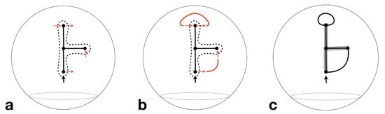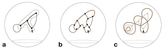 In addition to a tree-rooted plane graph (Figure 5a), a Mullin code can also be interpreted as a 3-regular plane graph with a rooted Hamiltonian circuit (Figure 5b), or a 4-regular plane graph with a rooted A-trail (Figure 5c). An A-trail is a non-crossing Eulerian circuit comprised exclusively of hard-right and/or hard-left turns. [20,21] In the Hamiltonian circuit interpretation, the Mullin contour is the circuit, non-tree edges become the outer non-Hamiltonian edges, and the perpendiculars of tree edges become the inner non-Hamiltonian edges. In the A-trail interpretation, the non-Hamilton edges of the previous interpretation shrink to zero length, turning the Hamilton circuit into the edges of a 4-regular map with vertices located at the centers of the original map’s edges.