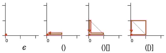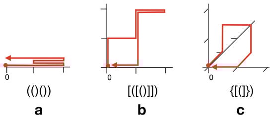 Strings of shuffled parentheses are hard to read and interpret, so the following visualization is often helpful. A word in can be seen as describing a constrained walk on the n-dimensional lattice, beginning and ending at the origin (Figure 6). Each style of parenthesis gets its own coordinate axis: An open parenthesis increments its coordinate, a close parenthesis decrements it. For example, a word in the Dyck language () describes an origin-to-origin walk, constrained to the positive half of the integer numberline (the 1D lattice); a word in describes an origin-to-origin walk constrained to the first quadrant of the 2D lattice; a word in (which we will have use for later) describes an origin-to-origin walk constrained to the first octant of the 3D lattice. For these examples, walks of steps (e.g., words of letters) are enumerated, respectively [23,24,25], by the kth Catalan number; , the product of consecutive Catalan numbers (This enumeration is not hard to calculate, but it proved for a long time hard to explain [26], because it implied an undiscovered bijection between words in and concatenations of two words in ), ; and the OEIS integer sequence A064037.