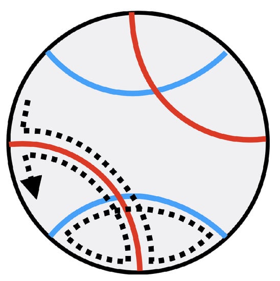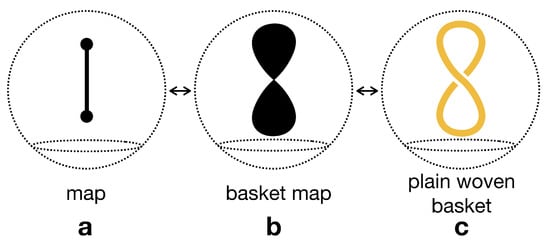 Use of the term ‘basket’ is justified by the fact that a face-bicolored 4-regular map is an alternating projection of a link; in effect, a projection of a plain-woven basket [27,28] (i.e., a basket woven in a strictly over-under-over-under pattern). The invertible mapping from a basket map to a plain-woven basket is summarized as follows: A weaver, standing in a region that is black in the basket map (Figure 8b), sees herself in the plain-woven basket (Figure 8c) surrounded by right-over-left weave crossings (conversely, left-over-right when standing in a white region). A physical model of Figure 8c (e.g., a belt given a full counterclockwise twist before being buckled) helps to verify that the weave crossings surrounding a region of a given color have the same appearance, regardless of whether the observer is standing on the ‘outside’ or ‘inside’ of the surface—orientation reversal introduces no difficulty in translating a basket map into a plain-woven basket.