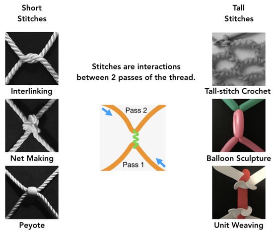 There exists extensive literature on fabric construction and mathematics. The classic work of Grunbaum and Shephard [4,5,6,7] pioneered research into which periodic weaves are isonemal. Fabrics that are not isonemal are not really fabrics at all, as a set of warp and weft threads (that are themselves mutually interwoven) can lift off from the rest. Contemporary computer graphic research is interested in both modeling the appearance of fabrics and designing stitch meshes to cover a three-dimensional modeled surface [8,9,10,11,12,13]. There is also an active mathematical interest in ornamental Celtic knots which cover a meshed surface [14,15,16]. The work presented here assumes that the individual stitches–crochet stitches, net making knots, and interlocked weaving units–are secure enough individually that isonemality is not a practical worry, although a mathematical proof is lacking. This work, also, has a distinctly different goal from most computer graphics research relating to fabrics: We are not trying to fit a fabric to a form, rather we are curious to see what forms emerge spontaneously from a simple formal language that describes fabrics.