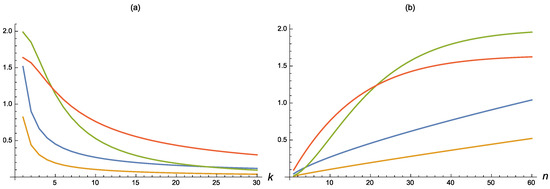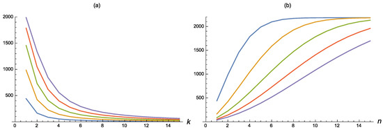 For suitable choices of n and k, such inaccuracy measures are plotted in Figure 1, where the parameters are chosen so that the considered distributions have a unity mean, i.e., (i) , (ii) , and (iii) , recalling that the mean of an inverse Weibull distribution is (see de Gusmão et al. [26]). In all cases, is decreasing in k and increasing in n.