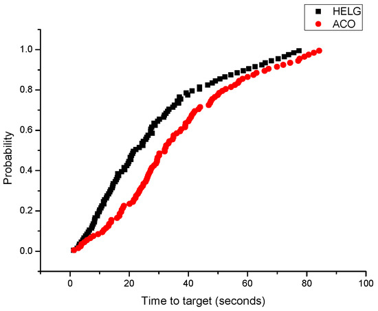 To further illustrate the efficiency contribution of our algorithm, we show the time-to-target plot [12,19] in Figure 2 to compare HELG with ACO on brock400_4 and its target 14. To obtain the plot, we performed 100 independent runs of each algorithm on brock400_4. The figure shows that the probabilities of finding a solution of the target value by HELG are approximately 30% and 70% in at most 13.78 and 33.43 s, respectively, whereas the probabilities of finding a solution of the target value by ACO are approximately 30% and 70% in at most 23.62 and 43.47 s respectively, considerably longer than HELG. From that, we can observe that the strategies we used in HELG are very effective.