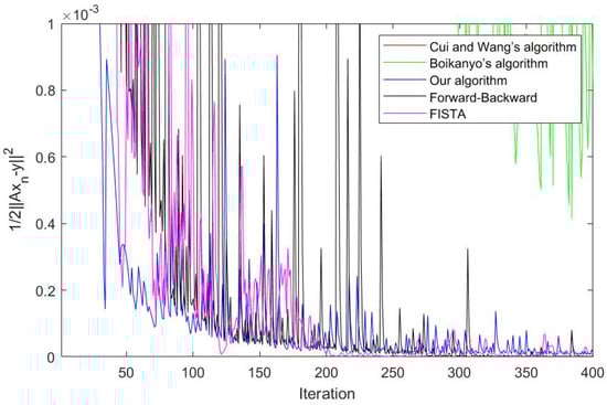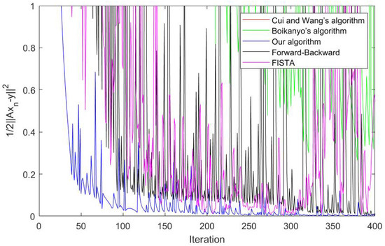 Figure 2, Figure 3, Figure 4 and Figure 5 show that the sequence improves the convergence profile of [14,15]. Our algorithm (Algorithm 5) converges faster than Cui and Wang’s algorithm and Boikanyo’s algorithm. Moreover, we compared our algorithm with the forward-backward splitting algorithm [24] and the fast iterative shrinkage-thresholding algorithm (FISTA) [25]. Sometimes, our algorithm converges faster than other algorithms, Figure 4 and Figure 5, but, sometimes, our algorithm converges slower than other algorithms, Figure 2 and Figure 3 . It depends on the control condition. This experiment is an example for the convergence of some algorithms.