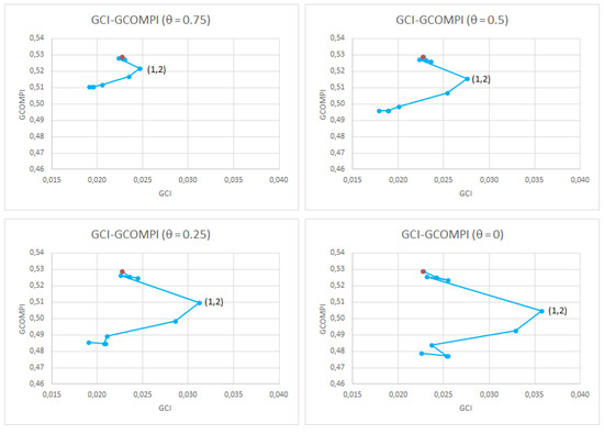Figure 1 and Figure 2 give the information provided in Table 6, Table 7, Table 8 and Table 9 in the form of graphs; they illustrate the relationship between the two indicator values, GCI and GCOMPI. Figure 1 shows the paths that these values follow in the iterative procedure (as new judgements are modified) for each value of θ separately, while Figure 2 shows all the paths in the same graphic presentation. The graphic visualisations help us to understand the relationship between the two indicators and to identify the steps of the algorithm that provide the biggest changes.