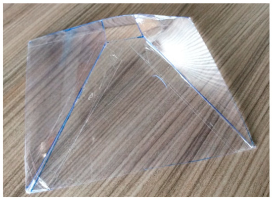 Construction of the hologram. Acetate was used since it is a transparent, semi-soft plastic material that is easily cut. In our experience, for the manufacture of each hologram, the students cut four trapezoids, whose measurements were calculated bearing in mind that the iPad Air® was going to be used as a device to project the videos. The dimensions of the trapezoids were: 13 cm for the greater base, 2.5 cm for the smaller base and 8.5 cm in height. It should be noted that, in this case, the construction of the hologram led students to become familiar with the calculation of the lateral area of the pyramid trunk. Once built, they were glued on their sides and obtained the pyramid trunk shown in Figure 2.