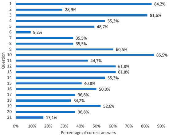 As mentioned above, the pre-test consisted of 21 questions of very simple concepts about the classification, parts, areas, and volumes of flat figures and some of them related to the obtaining of geometric bodies without to use of formulas. Figure 3 shows the percentages of correct answers to the pre-test of all the students.