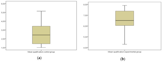 Box plots of the mean qualifictions. (a) Box plots of the mean qualifications in the post-test in the control group; (b) Box plots of the mean qualifications in the post-test in the experimental group.