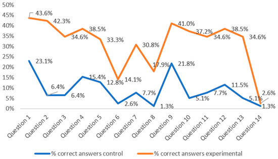 As it has been mentioned above, the qualifications obtained have been low for both the control and the experimental groups as it was the first-time students had seen these concepts, and the post-test was answered immediately after the learning experience. In addition, in the specific qualifications per question, it is also appreciated that the values of correct answers were also low for both groups, although they were higher in the case of the experimental group, since questions did not exceed 45% of correct answers.