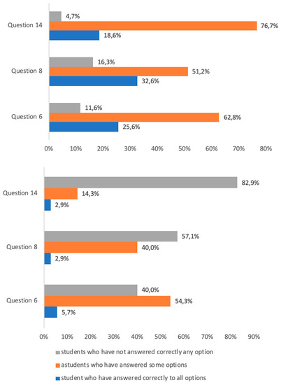 In Figure 5, it can be seen that there has been a gain of between 20% and 30% in most of the questions in the experience with the hologram, with the exception of questions 6, 8, and 14, which have the least differences. It is interesting to understand the reason for future improvements to the tool or methodology. The results for questions 6, 8, and 14 corresponding to the students of the experimental and the control groups are shown in Figure 6.