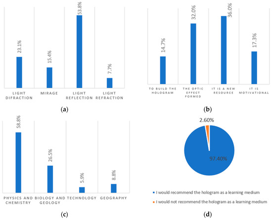 As was proposed by Serra et al. [4], the hologram can be considered as a teaching medium, since its foundation is supported by the principles of general pedagogy. It is worth highlighting studies, such as those of Lee [19], which explain how the adequate implementation of holograms in the classroom enables students to be in an attractive environment. This, in turn, allows them to have greater concentration and to build their own learning process. Another study presented by Walker [20] shows the advantages of using holography as a teaching medium.