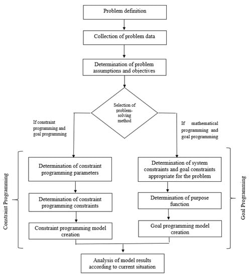 Looking at studies from different application fields in the literature (e.g., References [,,,,,,]), the goal programming method allows decision-makers to simultaneously realize different goals [,]. The most important features that distinguish constraint programming from mathematical programming include mathematical constraints or constraints that can be of a logical or symbolic type [,,]. The integrated goal programming and constraint programming methods, which are used in the solution process, are effective solution tools for researchers. Each objective set in the integrated goal programming and constraint programming methods is defined as a constraint and minimizes deviations from these objectives. A solution can always be obtained using these methods. However, the resulting decision-makers must be satisfied []. The constraint programming method can include mathematical constraints, as well as constraints that can be logical or symbolic. Constraint programming problems have structures that contain the definition set, constraints, and purpose of the decision variables, are identified with an appropriate language, and are solved via polynomial. Mathematical modelling is used for the solution of the problem []. However, due to the nature of the problem, the integrated goal programming and constraint programming models were developed, as it was desired to simultaneously perform more than one purpose. These methods were integrated with each other in the study.