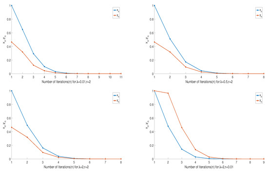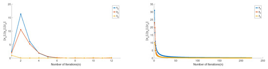 the bifunction ϕ by . In this example, we set the parameters in Algorithm 2 and Algorithm 3 by , , , and for each .