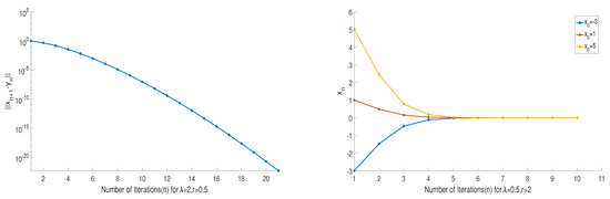 The problem SVIPs (5) and (6) constituted a pair of variational inclusion problems which have to be solved so that the image under a given bounded linear operator A of the solution of the problem SVIP (5) in is the solution of the other SVIP (6) in another Hilbert space . Indeed, one can see that and . The SVIPs (5) and (6) is at the core of modeling many inverse problems arising from phase retrieval and other real-world problems, for instance, in sensor networks in computerized tomography and data compression (see, for example, [34,35,36]).