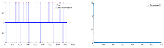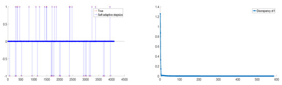 In the last example, we choose a problem from the field of compressed sensing according to the review comments, that is the recovery of a sparse and noisy signal from a limited number of sampling. Let be K-sparse signal, . The sampling matrix is stimulated by standard Gaussian distribution and vector , where is additive noise. When , it means that there is no noise to the observed data. Our task is to recover the signal from the data b. For further details, one can consult with Nguyen and Shin [34].