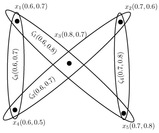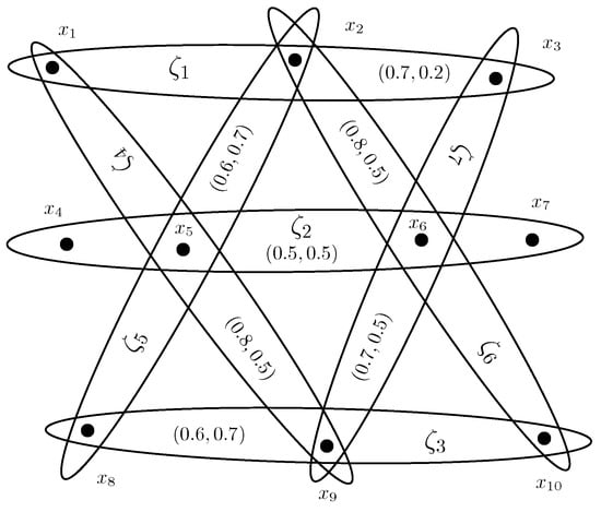 Let the set of vertices of seven-ROFH be taken as representative of those attributes’ characteristics that one considers to make a comparison between different housing societies. The hyperedges of seven-ROFH represent some housing schemes that will be compared. The portrayal of our problem is illustrated in Figure 8.
