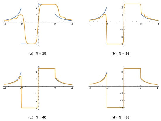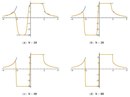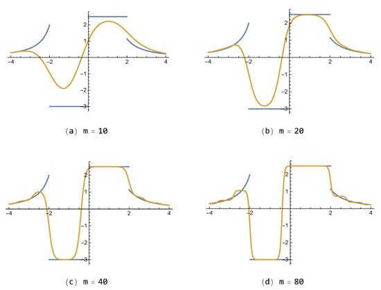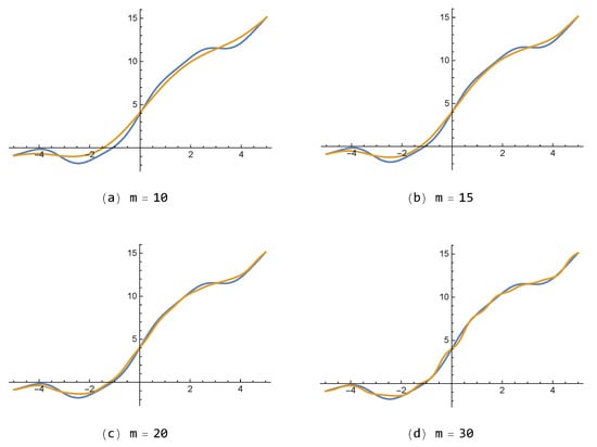 Figure 7. On the other hand, it is noted that the FNN approximations are free from the so-called Gibbs phenomenon, generating wiggles (i.e., overshoots and undershoots) near the jump-discontinuity, which appears inevitably in partial sum approximations composed of the polynomial or trigonometric base functions in general.