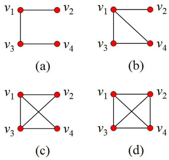 Four situations of two independent edges and in a graph of vertices. The construction process will reduce three edges to one edge for (a) (). Similarly, , , and for (b–d), respectively. Clearly, (a) is the “worst” case. It is straightforward to verify that, in general, in a graph of vertices, we have for such worst cases, but .