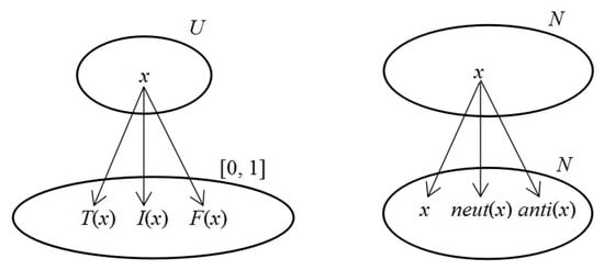 The contrast between the neutrosophic set and the neutrosophic triplet group are as shown in Figure 1.