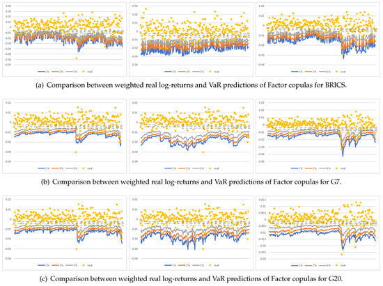 Comparison between real log-returns and VaR predictions of Factor copulas for BRICS, G7, and G20. From left to right are pre-crisis, crisis, and post-crisis periods.
