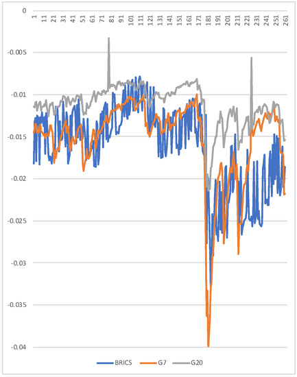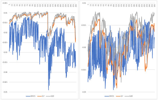 where X stands for countries contained in the studied group, is the corresponding market capitalization, and n = 5 for BRICS, n = 7 for G7, and n = 19 for G20. Similarly, we were able to get the real weighted log-returns. After that, we simply obtained the VaR and ES from the simulations.