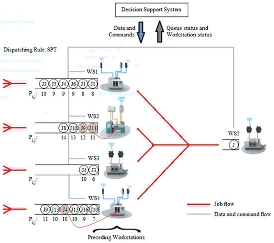 The DSS first determines which of these jobs could be processed next in WS5 by checking WS1, WS2, WS3, and WS4. The job numbers colored in gray in each queue in Figure 3 are the jobs that could be processed in WS5, namely J4, J9, and J11. Among them, J4 is selected since it has the smallest processing time (according to SPT). This job is in the WS4 queue, and hence will be processed in the WS4 as soon as it becomes idle.