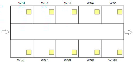A simulation model for a job-shop production environment, developed in Arena, is used to assess the effects of the proposed DSS. The virtual job-shop environment starts the production with the arrival of a demand for a job. It is assumed that there is a continuous dynamic job demand arrival. Manufacturing takes place at 10 workstations and real-time data can be obtained from them. Each workstation has a different numbers of machines. The representative layout of this job-shop environment is shown in Figure 4.
