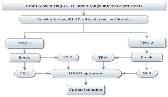 According to the discussion of Linear Programming issues with Rough Interval Coefficient (LPRIC) in Appendix A.1, at first, we get two different transportation problems (TPIC-1, TPIC-2) with interval coefficients—and again, as discussed, TPIC-1 and TPIC-2 broken as TP-1, TP-2 and TP-3, TP-4. The above stated consideration can be graphically represented in Figure 2.