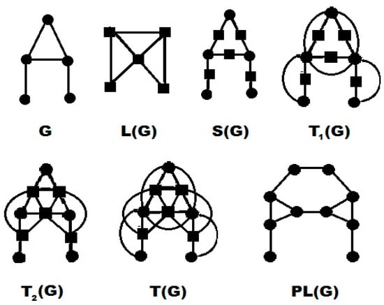 In Figure 2, self-explanatory examples of these derived graphs are given for a particular graph. In every derived graph of (except the paraline graph ), the vertices corresponding to the vertices of are denoted by circles and the vertices corresponding to the edges of are denoted by squares.
