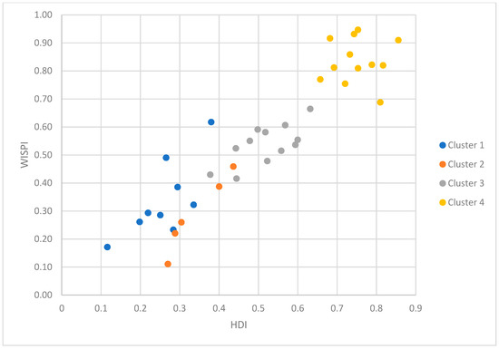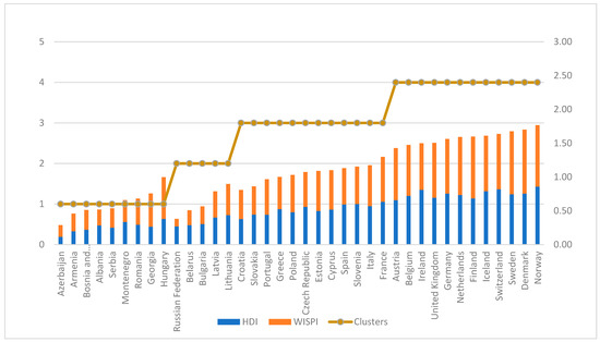 In the following, the performed comparative analysis of WEBIRA method results with the results of cluster analysis is discussed. The clustering procedure was executed with standardised data. Based on the silhouette method, the European countries could be divided into four clusters. The partition into clusters was done by several hierarchical clustering methods and also techniques like k-means cluster analysis. The challenge when applying the hierarchical clustering methods is determining the proper distance measure. In our work, we have tested different distance measures, but there are alternative methods like A-BIRCH [35]. All of the used methods gave very similar results, so we chose the k-means method. Therefore, neither clustering approach can ultimately judge the actual quality of clustering; this needs human evaluation [36], which is highly subjective [37]. Because of these shortcomings, cluster analysis can only be used as rough initial test before applying more accurate methods. Table 6 shows the ranking of the European countries by using methods WEBIRA, HDI, WISPI and cluster analysis results. Table 6 and Figure 1 show that the WEBIRA ranking of countries is basically consistent with the results of cluster analysis. Spearman correlation coefficient of WEBIRA ranks and k-means cluster analysis results show very high correlation between them All countries with the highest HDI and WISPI indicators have entered cluster 4. Cluster 3 consists of slightly lower HDI and WISPI countries with one exception—Hungary—which is the member of cluster 1. The countries with lowest HDI and WISPI are assigned to cluster 1. The most diverse is cluster 2, which consists of countries which at first glance do not have much in common, i.e., Lithuania, Latvia, Belarus, Bulgaria and Russian Federation. Figure 2 represents cluster analysis results on HDI and WISPI axes. It also shows that WISPI indicators in all cluster 2 countries except Lithuania are lower than in other countries adjacent to these in WEBIRA ranking.