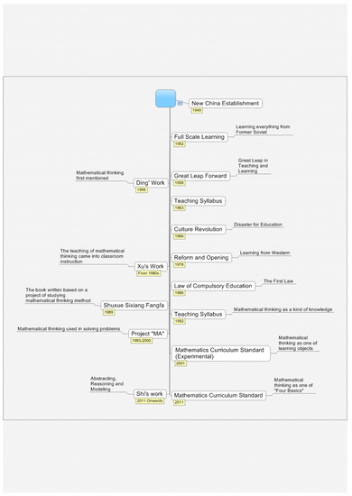 Mathematical thinking (MT) is essential for teaching and learning mathematics [1]. It is not only the foundation for children’ development [2] but also the cornerstone of students’ sustainable development in mathematics [3]. Studies have shown that Asian mathematics teachers used to explain mathematics subjects matter in more depth and place a greater stress on thinking and understanding [4,5]. Especially in China (in this study, mainland China is considered), mathematical thinking (MT) is paid much attention in classroom instruction, which can be seen as the most important feature of Chinese mathematics education [6]. Hence, the stress on MT can help to explain Chinese students’ good outstanding performance in international assessment [7,8,9,10], such as the Trends in International Mathematics and Science Study (TIMSS) and the Programme for International Student Assessment (PISA). While mathematics education in East Asian countries, such as Singapore and Japan, has been devoted significant attention, however, much less attention has been paid to Chinese mathematics education [11]. Consequently, introducing the unique characteristics in Chinese mathematics education would open a door for others to know more about Chinese mathematics education. The primary goal of this study is to provide a comprehensive understanding of mathematical thinking based on the statements of MT in the official documents.