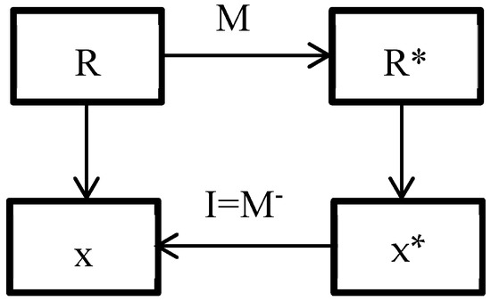 Figure 2 (below) illustrates the process described above. R, R*, x and x* can be given the following meanings: R—the relationship system of the practical problems; R*—the relationship system of the theoretical problems; M—the process of moving from the practical problems to the theoretical problems; I = M−1—the inverse process of moving from the theoretical problems to the practical problems; x*—the mapping image of an unknown x in a practical problem. It can be seen that modeling and abstracting are involved in this process.