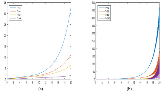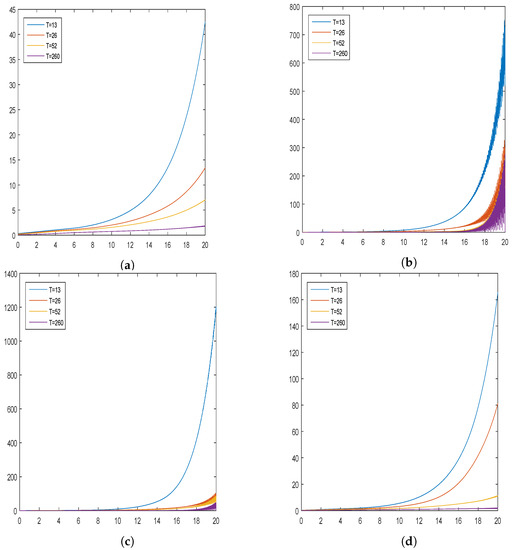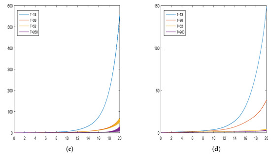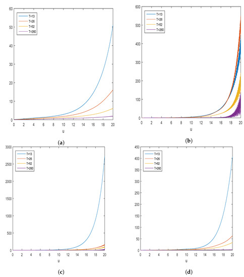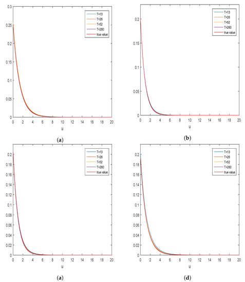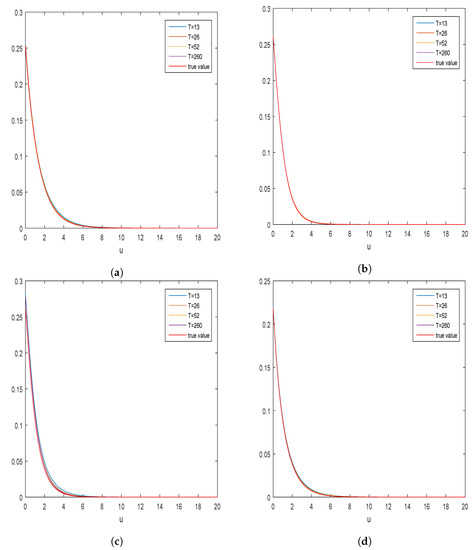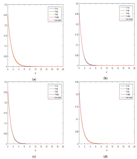 We set , and , where can be explained as one week. That is to say, in a long time interval, the insurer will observe the data once a week, the expected claim number is 2 times per week, and the expected premium number is 5 times per week. Furthermore, since there are 52 business weeks every year, we assumed that , which means that we observed the surplus process for one quarter, half a year, one year and five years. Then, we used Equation (13) to estimate the above Gerber-Shiu functions, and the corresponding true value obtained by Laplace inversion. In all simulations, we set , and we carried out the relevant analysis based on 300 simulation experiments. We first introduce several concepts used in this section. The mean value and the mean relative error, which are, respectively, defined by