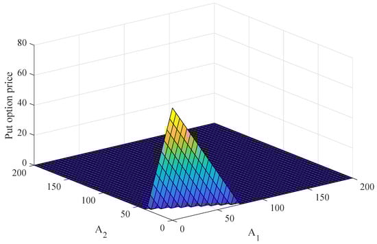 The explicit solution surface plot of the European put option price obtained from the Black–Scholes model with two stock prices, and correlation .