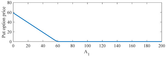 The different values of European put options for non-positive correlation case and and non-negative correlation case and are plotted over a range of stock prices and at the maturity time, as shown in Figure 4. The results show that the correlation has an effect on the European put option. Furthermore, when stock prices both increase, this leads to an increase in the difference between the value of the European put options.