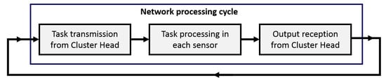 The specific selected application, namely the parallel computing field, imposes some constraints. Firstly, all the tasks require almost the same computational effort; for the sake of simplicity, in this paper, they have been considered equal. Moreover, a process cycle of the entire network consists of the transmission of the tasks from the cluster head to the sensors, the following elaboration, and in the final collection of the processed outputs. The following cycle can start only when all the outputs are collected, as represented in Figure 1.