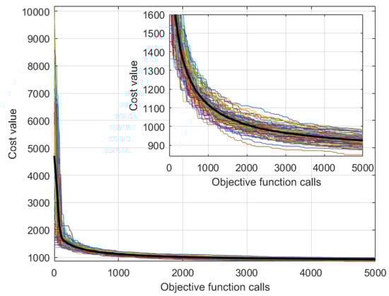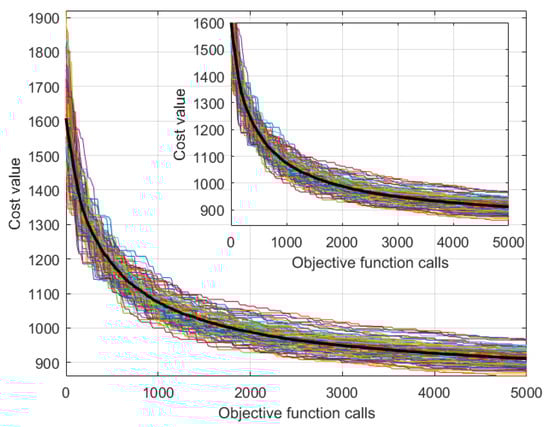 Figure 9 shows the convergence curves of the 100 independent trials. Here, the zoom is important to see the good convergence of the trials and the low standard deviation. Also in this case, it is possible to notice that all the results had a cost value below 1000.