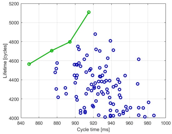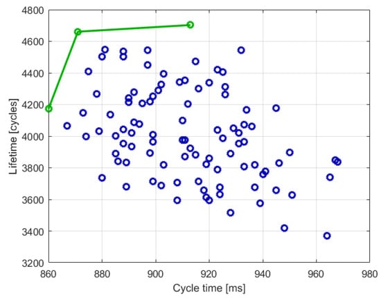 As done previously, it is possible to represent the obtained solutions as the maximum cycle time–lifetime plane. Figure 10 shows the 100 optimal values obtained by SNO. The four green dots are the Pareto front.