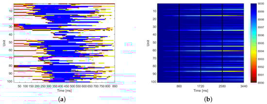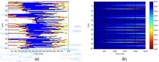 The optimal scheduling of one elaboration cycle is represented in Figure 7a. The red color represents the receiving mode, the blue the elaboration status, and the yellow the transmitting mode. White color is the idle status.