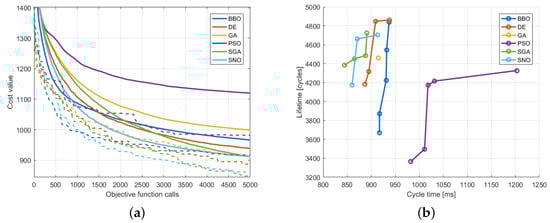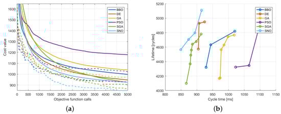 Figure 12a shows a comparison in terms of convergence curves: the continuous line is the average convergence, while the dashed line is the best trial. Figure 12b shows a comparison of the Pareto front: in this figure, it is possible to notice that the results of SNO are much better than the ones of the other algorithms.