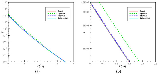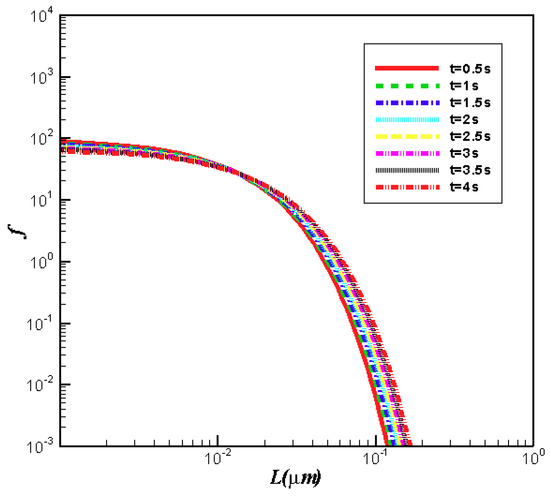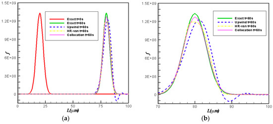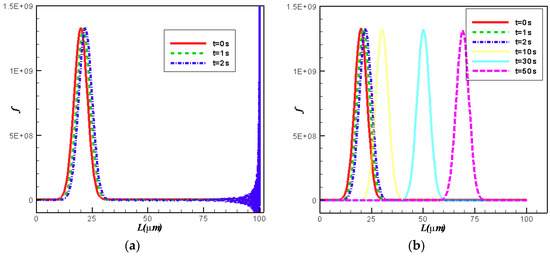 Figure 5 presents the evolution of CSD obtained using the Chebyshev spectral collocation method. As we can see in Figure 5, there is no oscillation during the computation. Therefore, the diffusive term is not necessary. This is not surprising. In this size-dependent growth case, the PBE is a convection–reaction equation (). The reactive term weakens the hyperbolic property of PBE and makes it easy to solve. This is reflected in the decay term “” of the analytical solution in Equation (18).